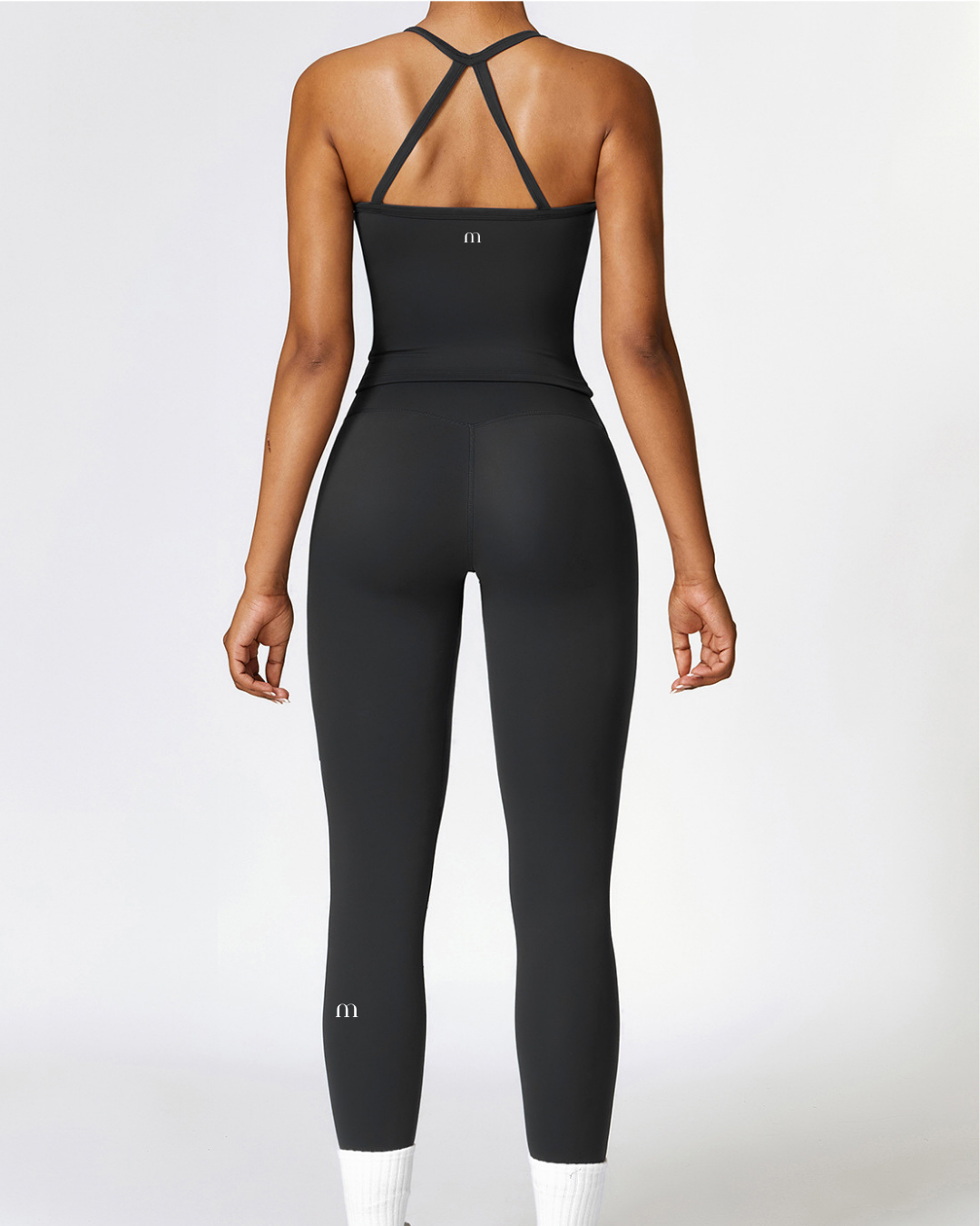 The Forme Set is designed to highlight strength through clean structure and precision fit. The fitted tank features a sleek scoop neckline with slim straps and a sculpting racerback design that enhances shoulder definition while allowing full freedom of movement. Its elongated silhouette smooths and contours the torso for a confident, powerful look.